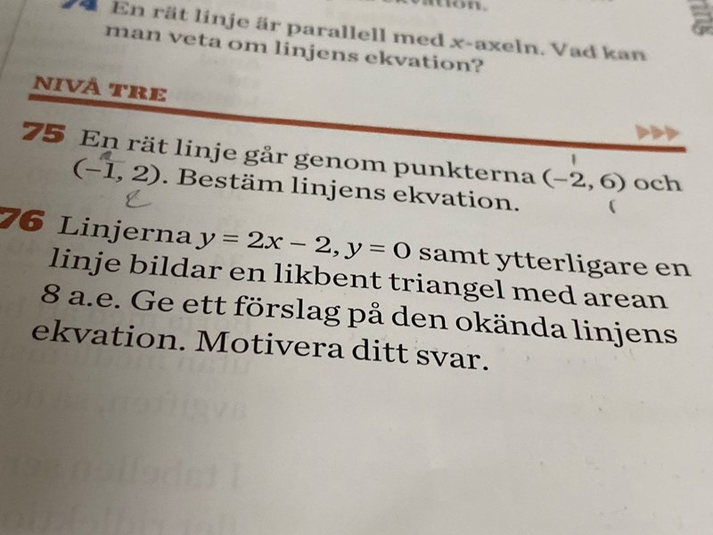 Hej! Jag löste denna uppgift genom att använda formler delta y/delta x, men då fick jag bara k-värdet. För att veta m-värdet behövde jag rita i punkterna i ett koordinatsystem. Finns det ett sätt att ta reda på m-värdet utan att behöva rita?