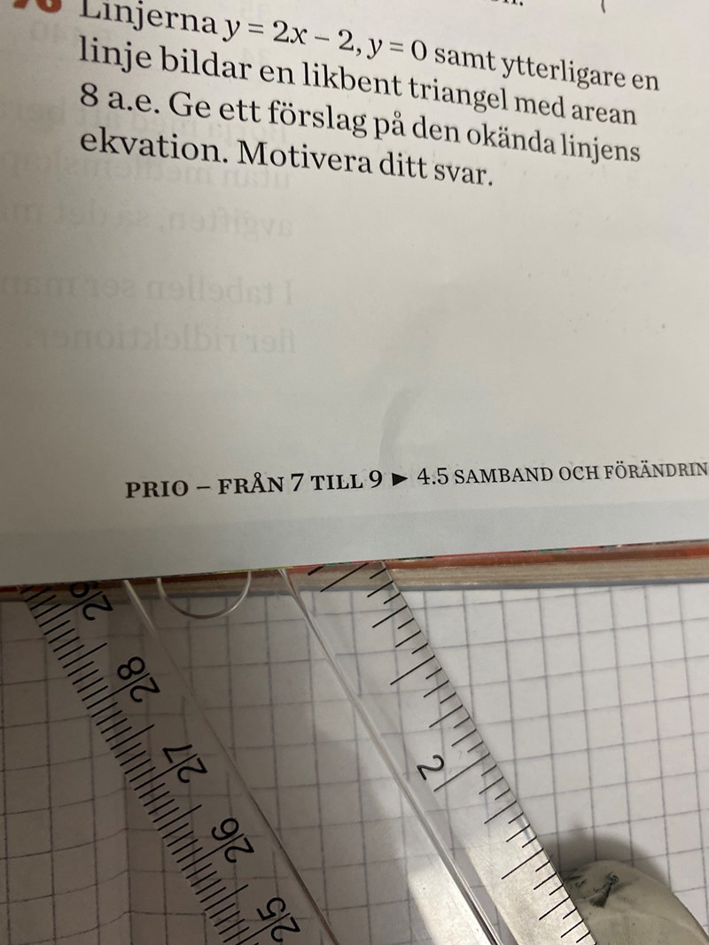Sten skrev:Nja, det är nog bäst att rita ut de kända linjerna. Då är det enklare att se hur man får triangeln likbent och hur man kan se till att triangelns area blir 8 a.e.
