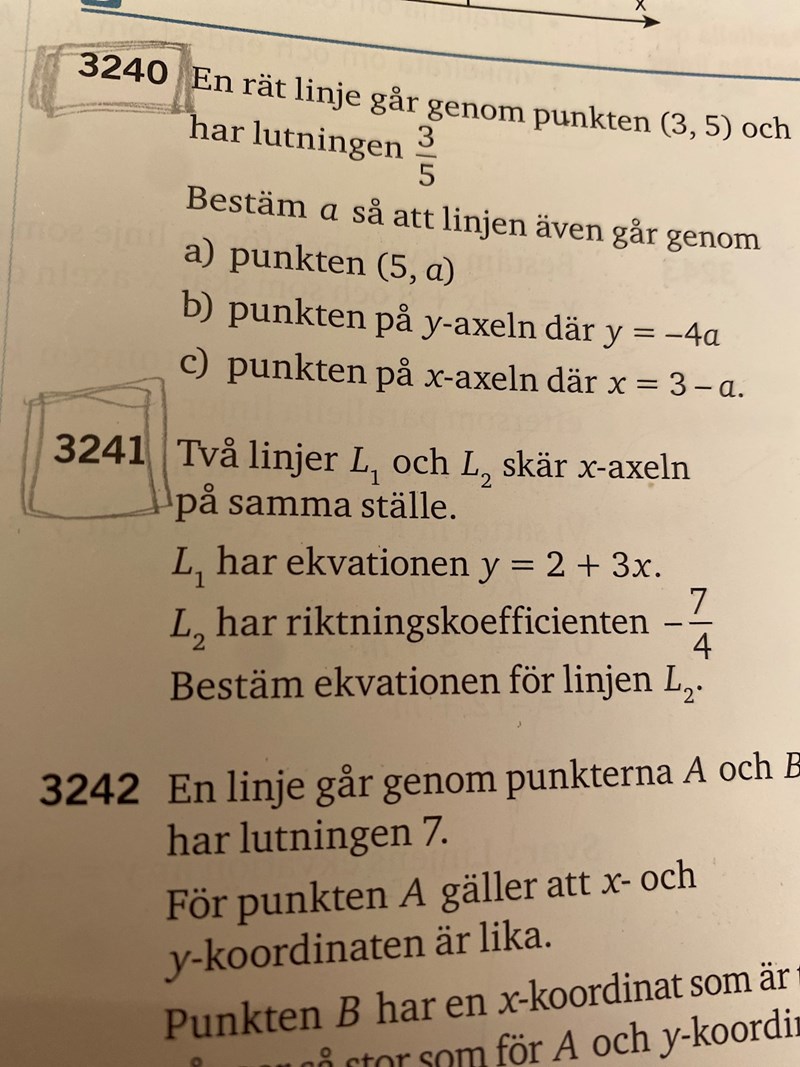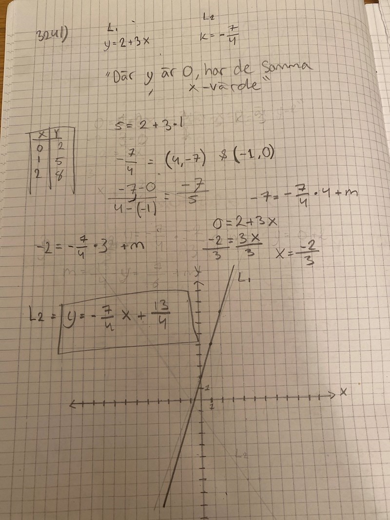 Bubo skrev:Ha en fin dag skrev:Hej! Jag har suttit med fråga 3241 ett tag men fastnar på ett steg. Jag har ritat grafen för L1 och jag vet att dör y=0 så har de samma x-värde.
