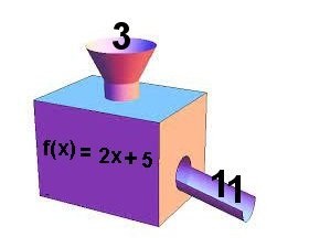 Här är en illustration till att en funktion är som en maskin där man stoppar in ett tal och får ut ett annat tal enligt den regel som är funktionen. Samma värde in ger alltid samma värde ut. Här är f(3) = 2*3+5 = 11.
