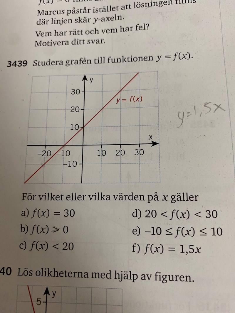 Är det uppgift 3439 det handlar om? Den linjen går inte genom origo, så y = 1,5x kan inte stämma. Fast du behöver inte ta fram någon formel som beskriver funktionen, du har ju grafen!