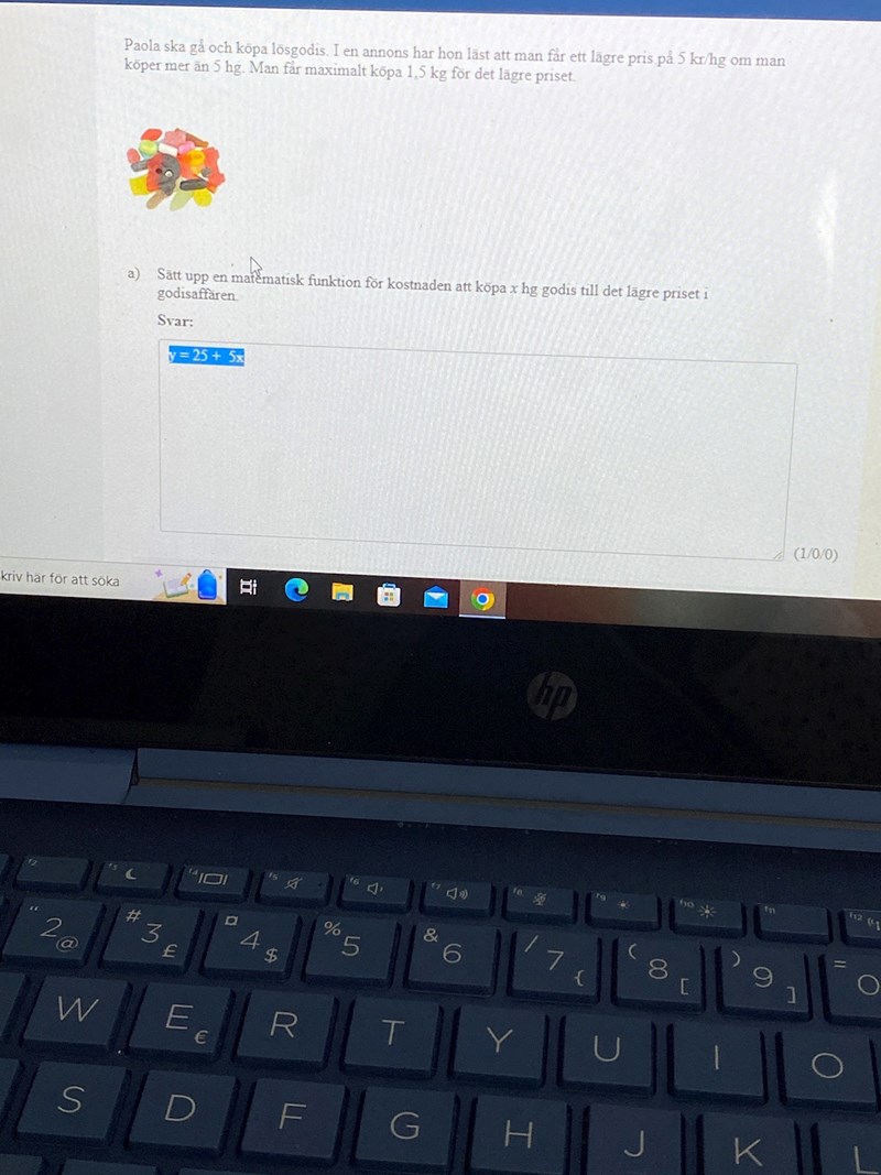 Hej! Jag förstår inte riktigt, frågan i a säger att man ska göra en funktion för det lägre priset i godisaffären men i facit svarar de y = 5x.