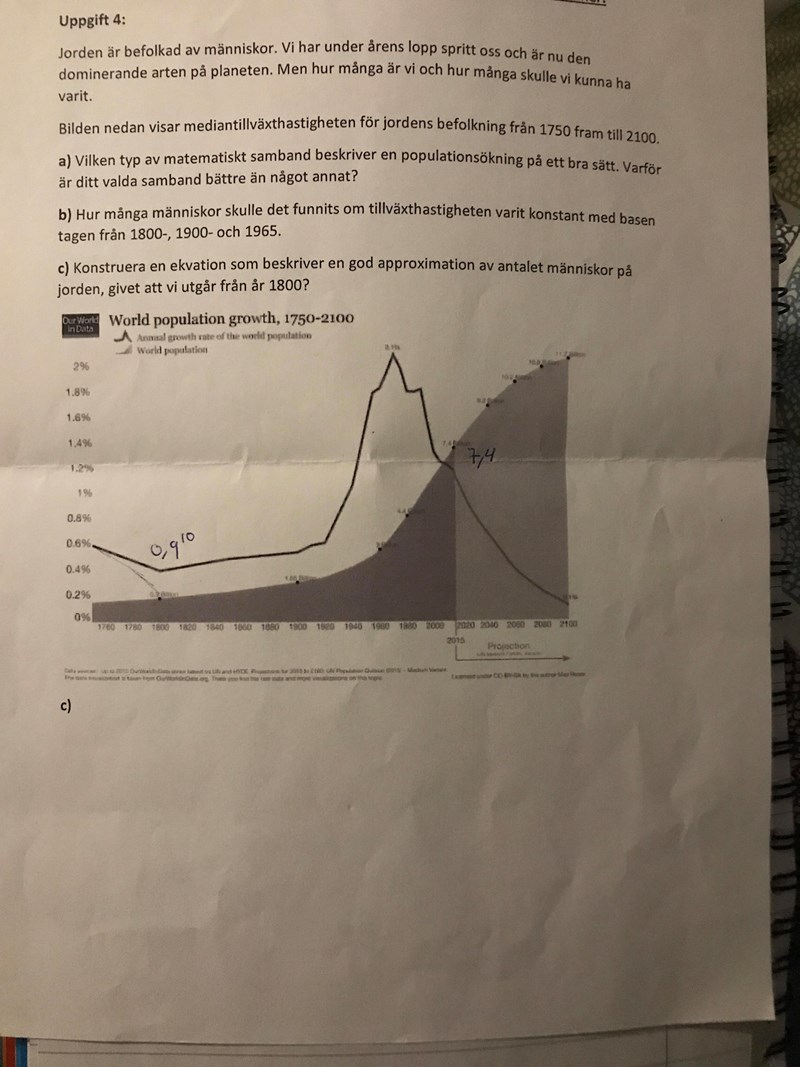 B uppgiften kom jag på att räkna från år 1800 till 2015= 215 år , från 1900 till 2015= 115 och från 1965 till 2015=50. Räknade hur många år det var fram till 2015. Och varför det står 0,9 upphöjt till 10 är för att det står på engelska 0,9 billions.