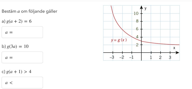 För uppg a, börja med att kolla för vilket x-värde funktionen har y-värde 6.