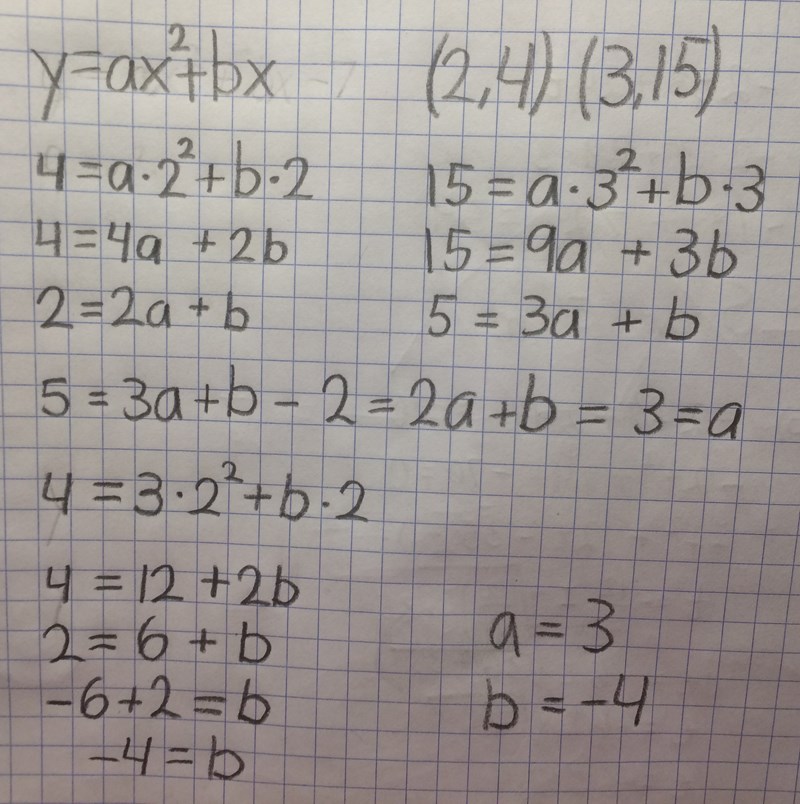 Duhar fått fram att funktionen är y=3x2-4. Särr in x=2 respektive x=3 och kolla om du får rätt y-värden! I så fall är det rätt, annars inte.