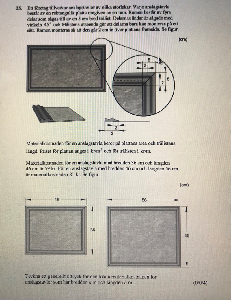Det generella uttrycket för den totala materialkostnaden för anslagstavlor som har bredden a m och längden b m.