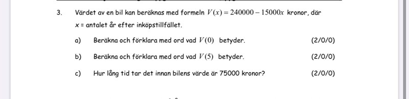 I c-uppgiften frågar de efter hur många år x som har gått när bilens värde V har sjunkit till 75 000 kronor.