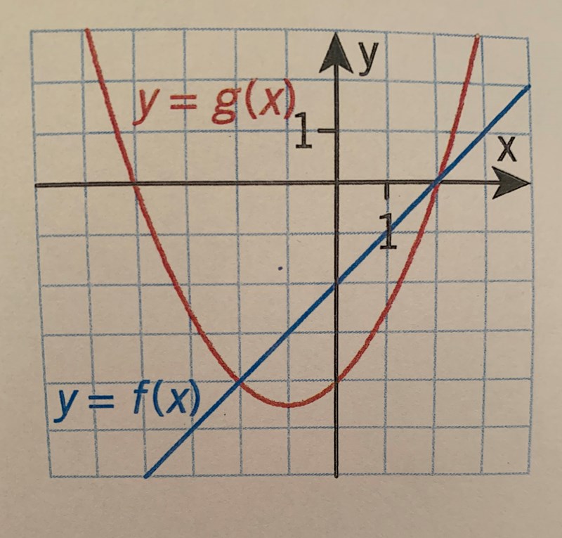 Teatime skrev:I koordinatsystemet visas graferna till den linjära funktionen y = f(x) och andragradsfunktionen y = g(x).