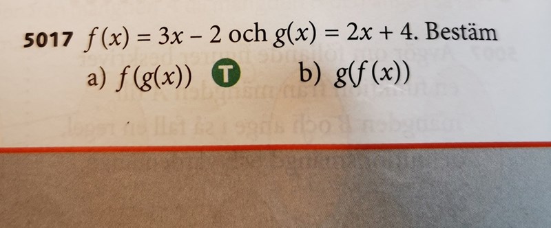 Jag förstår inte riktigt hur man räknar ut den. På a) tänkte jag att x=3x-2 då är g 2x*3x - 2=6x2-4x+4.