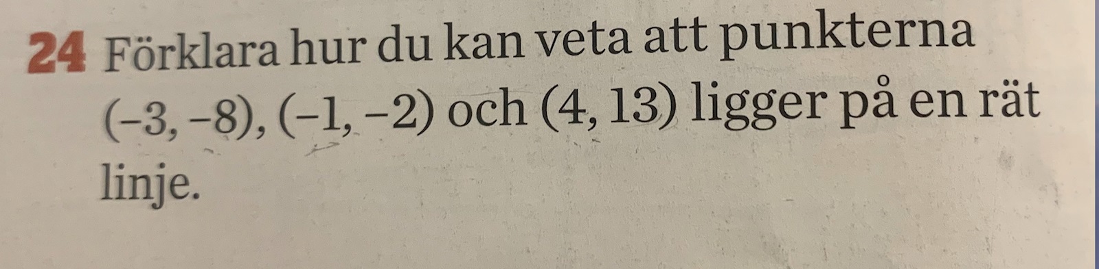 Jag förstår inte hur jag ska göra. Ska jag använda mig av räta linjens ekvation, och skriva upp ekvationen för dessa punkter? Men det känns som att det är för "komplicerat", att jag borde på något sätt kunna se att dessa ligger på en rät linje...