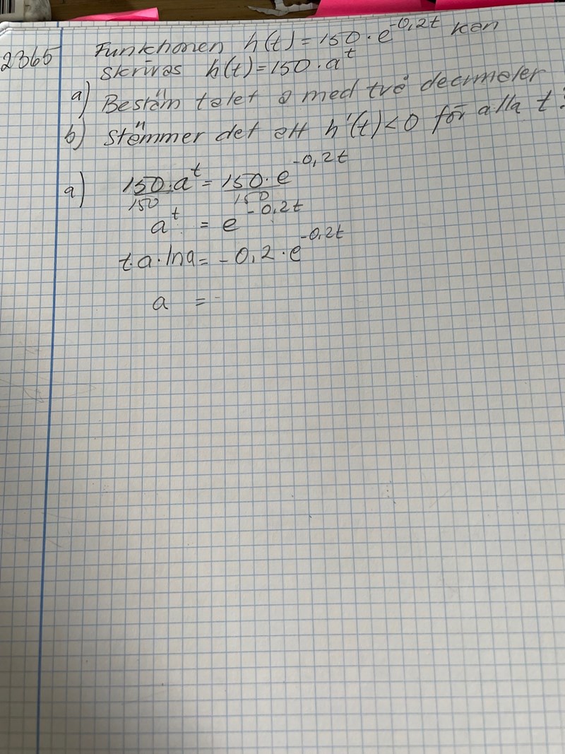 Jag ser inte att du har försökt sätta 150e-0,2t = 150at.