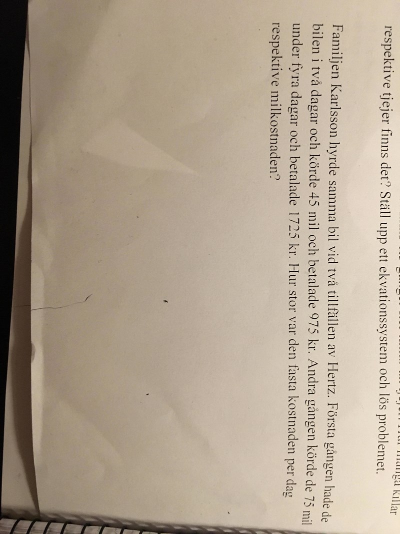 Fast kostnad x kr/dag, milkostnad y kr/mil. En ekvation för varje fall. Lös ekvationssystemet.