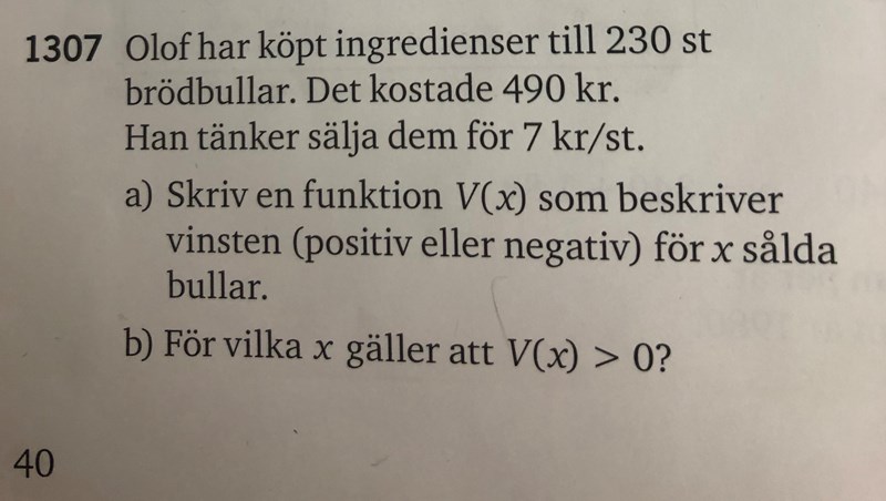 Vinsten för varje såld bulle är 7-2,13kr=4,87kr.