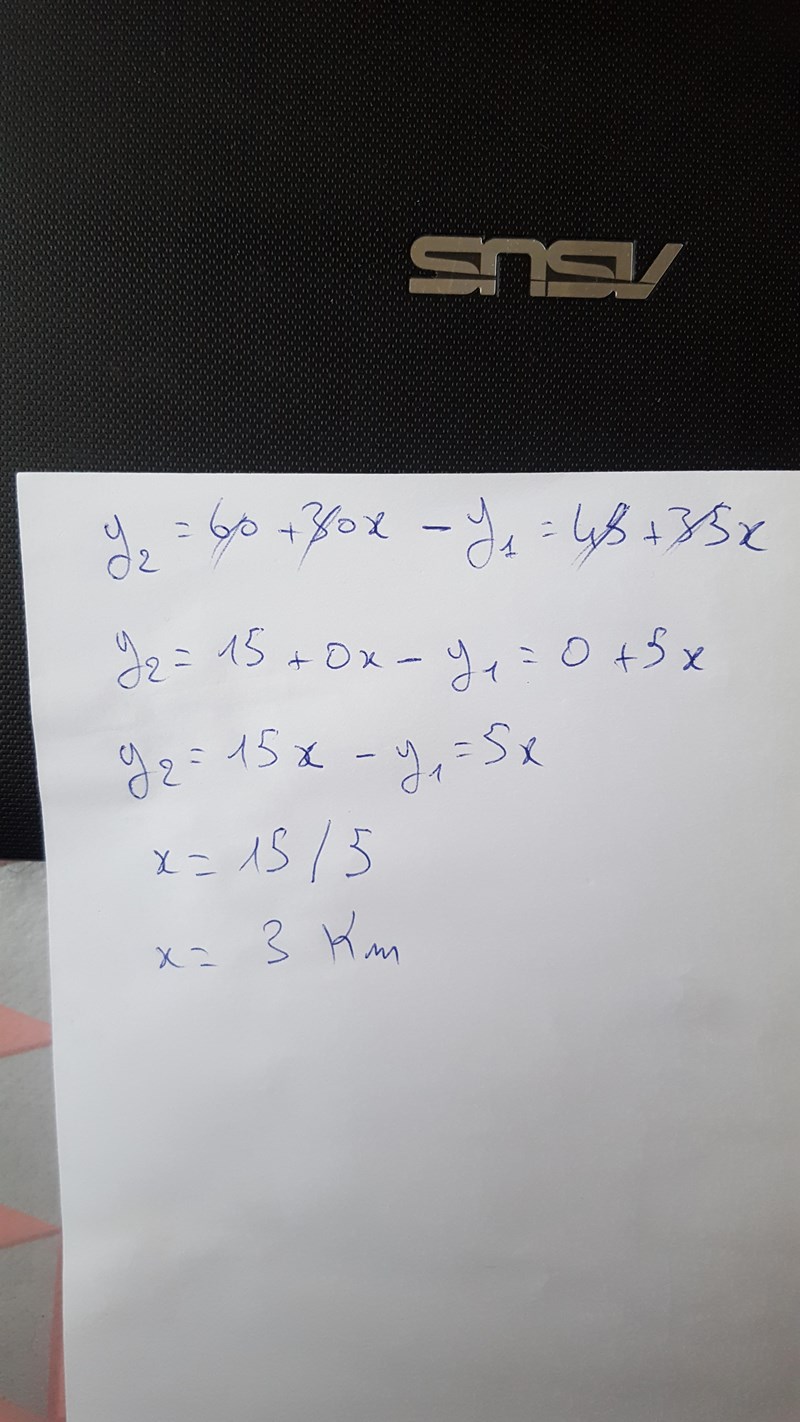 Om du tar 2km vad får du då? 45+35x2 och 60+30x2 om du sätter 35X+45=30X+60 och räknar ut x så vet du när det blir billigare med det andra bolaget.