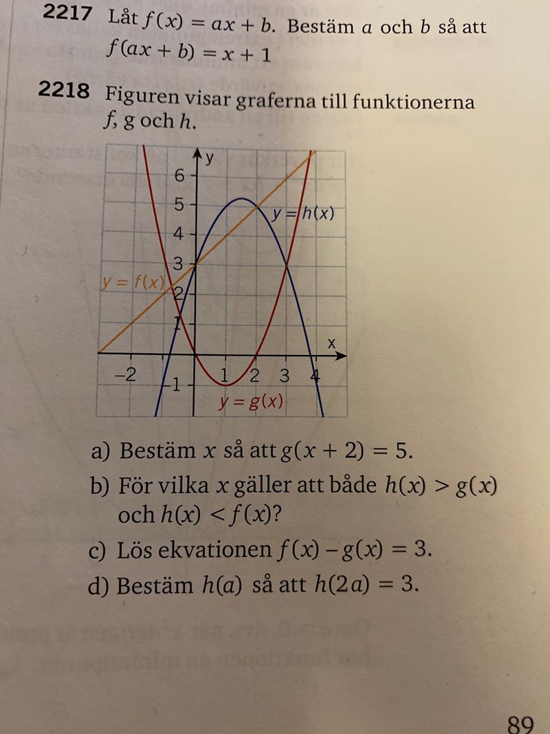 b) h(x) är den blå och g(x) den röda kurvan. Att "h(x)>g(x)" innebär att den blå kurvan befinner sig ovanför den röda.