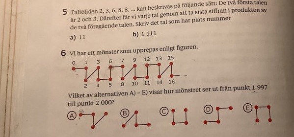 Uppgift 5a lyckades jag lösa genom att skriva upp hela talföljden fram till nummer 11. Men det kommer ju att ta hela dagen om jag ska göra så ända fram till nummer 1 111.