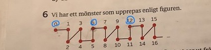 På uppgift 6 så är en serie 6 punkter långt innan serien upprepas. Alltså måste punkten som en ny serie börjar med vara delbart med 6. (De punkterna har jag markerat med blått på bilden nedan för att förtydliga).