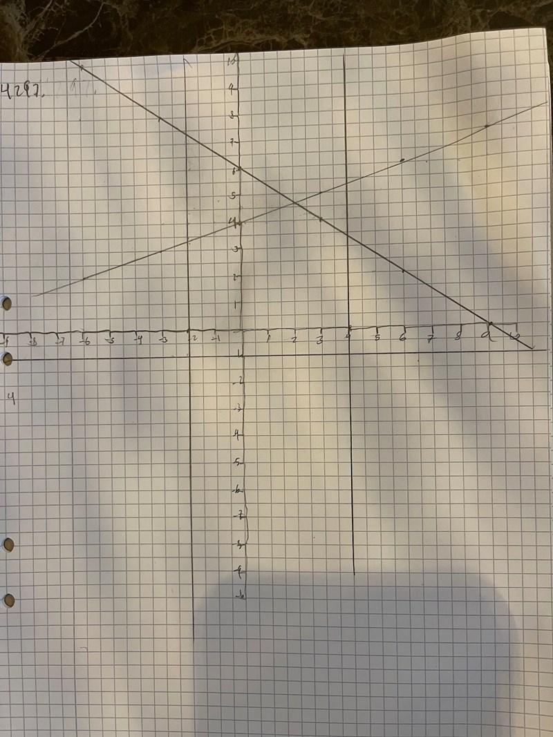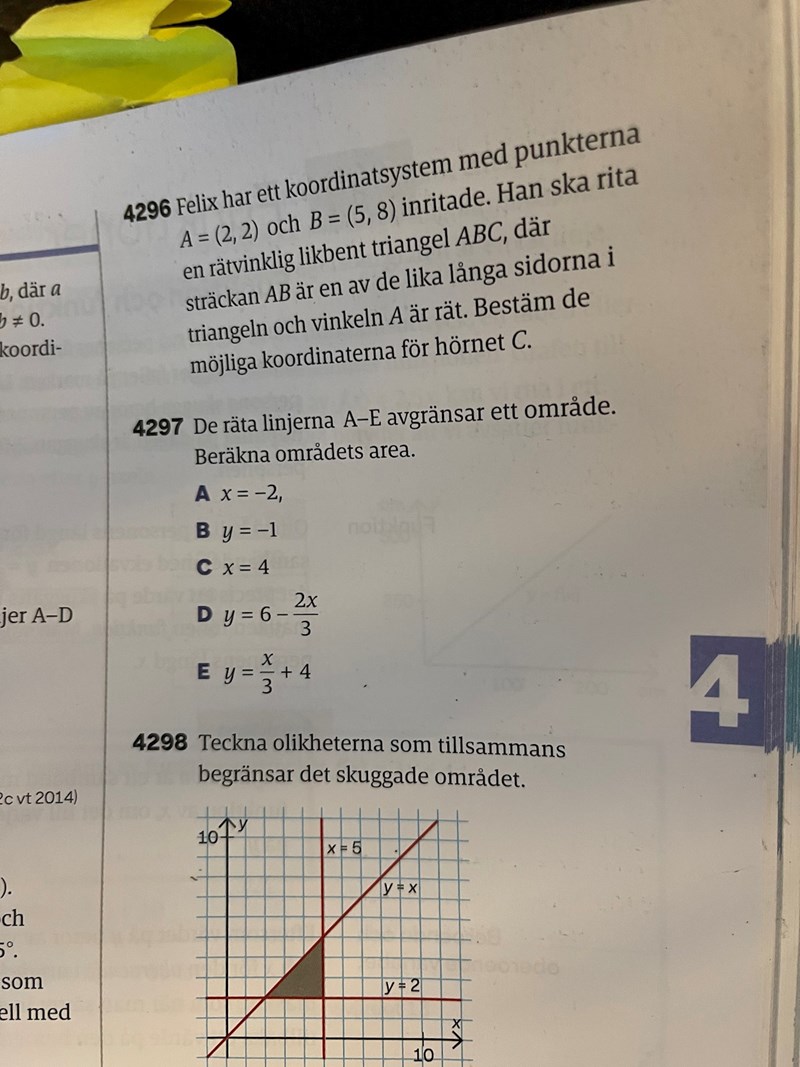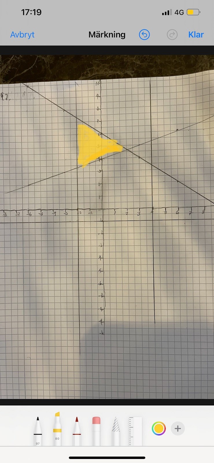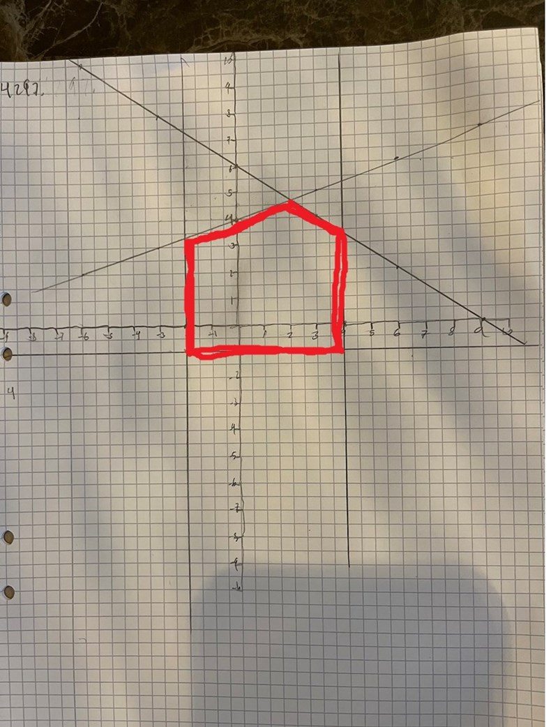 Grovt räknat: En rektangel med basen 6 och höjden 4,5 och en triangel med basen 6 och höjden 1: 27 + 3 = 30. Du behöver beräkna y-värdet för de båda sneda linjerna när x = -2 respektive 4, och skärningspunkten mellan dem.