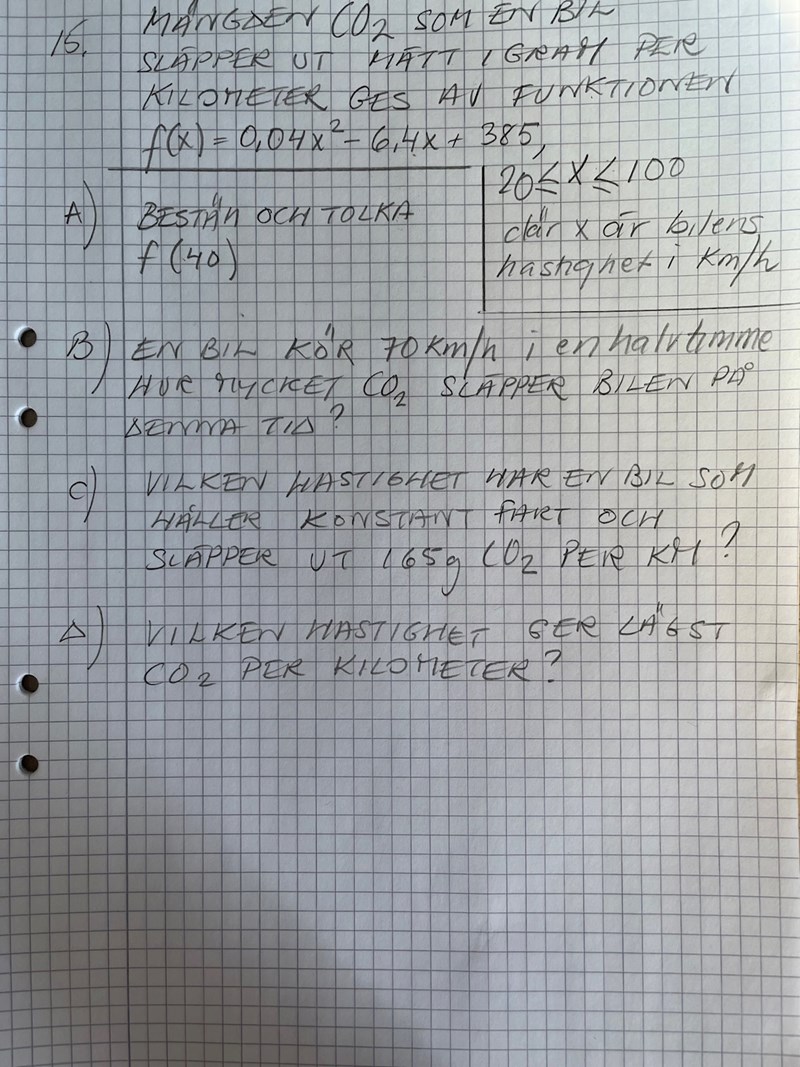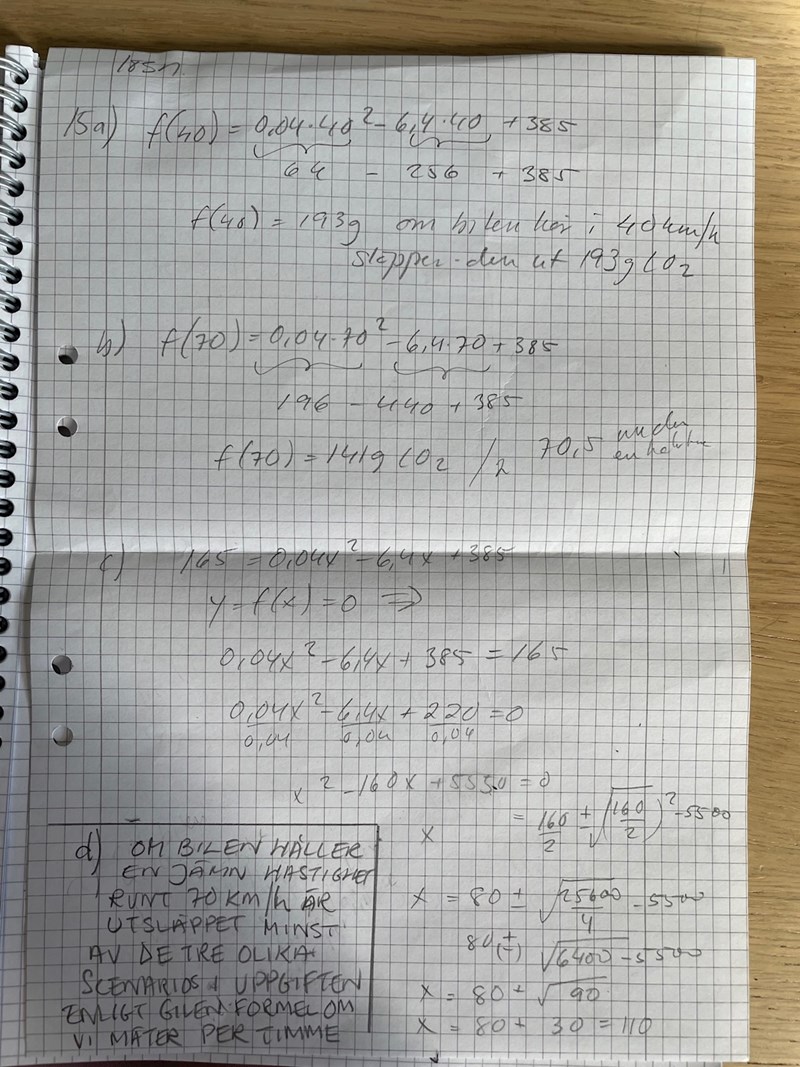 För d) Jag tror att du ska hitta minimivärdet för funktionen, och det är inte vid 70 km/h.