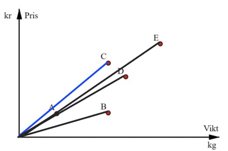 Chokladkaka C har högst kilopris, det kan ses i diagrammet då kr/kg (kilopriset) är respektive chokladkakas vertikala koordinat dividerat med respektive chokladkakas horisontella koordinat. C är den chokladkakan som har jämnaste förhållandet mellan den vertikala och horisontella koordinaten, de andra chokladkakorna har en större horisontell koordinat än vertikal koordinat vilket ger ett lägre kilopris. Därmed har chokladkaka C högst kilopris då det är den enda chokladkakan som har ett jämnt förhållande mellan den vertikala och horisontella koordinaten, vilket ger den ett högt kilopris. Det är viktigt att nämna att om en chokladkaka har ett ojämnt förhållande mellan den horisontella koordinaten och den vertikala koordinaten, där den vertikala koordinaten är större än den horisontella, blir kilopriset högt. Däremot, har de andra chokladkakorna (A, B, D och E) ett ojämnt förhållande med större horisontell koordinat än vertikal, vilket då ger ett lågt kilopris.