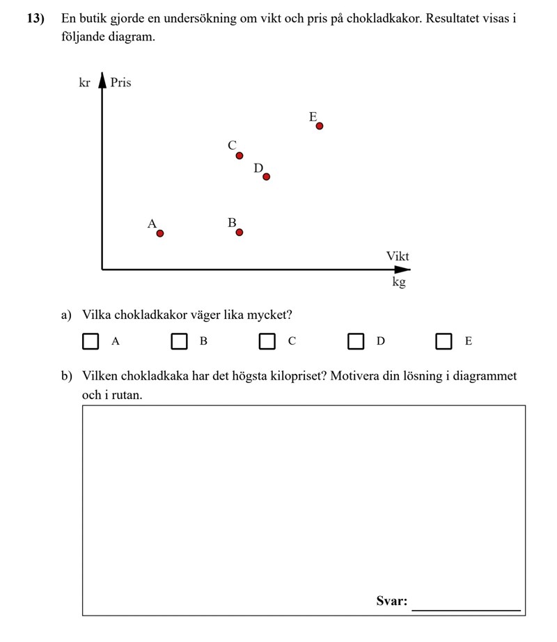 Chokladkaka C har högst kilopris, det kan ses i diagrammet då kr/kg (kilopriset) är respektive chokladkakas vertikala koordinat dividerat med respektive chokladkakas horisontella koordinat. C är den chokladkakan som har jämnaste förhållandet mellan den vertikala och horisontella koordinaten, de andra chokladkakorna har en större horisontell koordinat än vertikal koordinat vilket ger ett lägre kilopris. Kilopriset är alltså linjens lutning (k-värdet) hos chokladkakan om man skulle dra en linje från origo till chokladkakan, det är för att delta y/delta x är samma som den Vertikala- dividerat med den horisontella koordinaten, vilket därmed blir k-värdet och kilopriset. Chokladkaka C är den chokladkaka med brantast lutning, alltså högst k-värde, vilket då betyder att den har mest vertikala koordinater i förhållning till horisontella, som därmed betyder att Chokladkaka C har högst kilopris av alla chokladkakor.