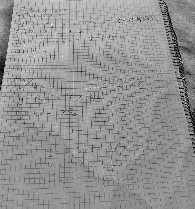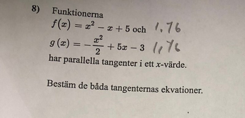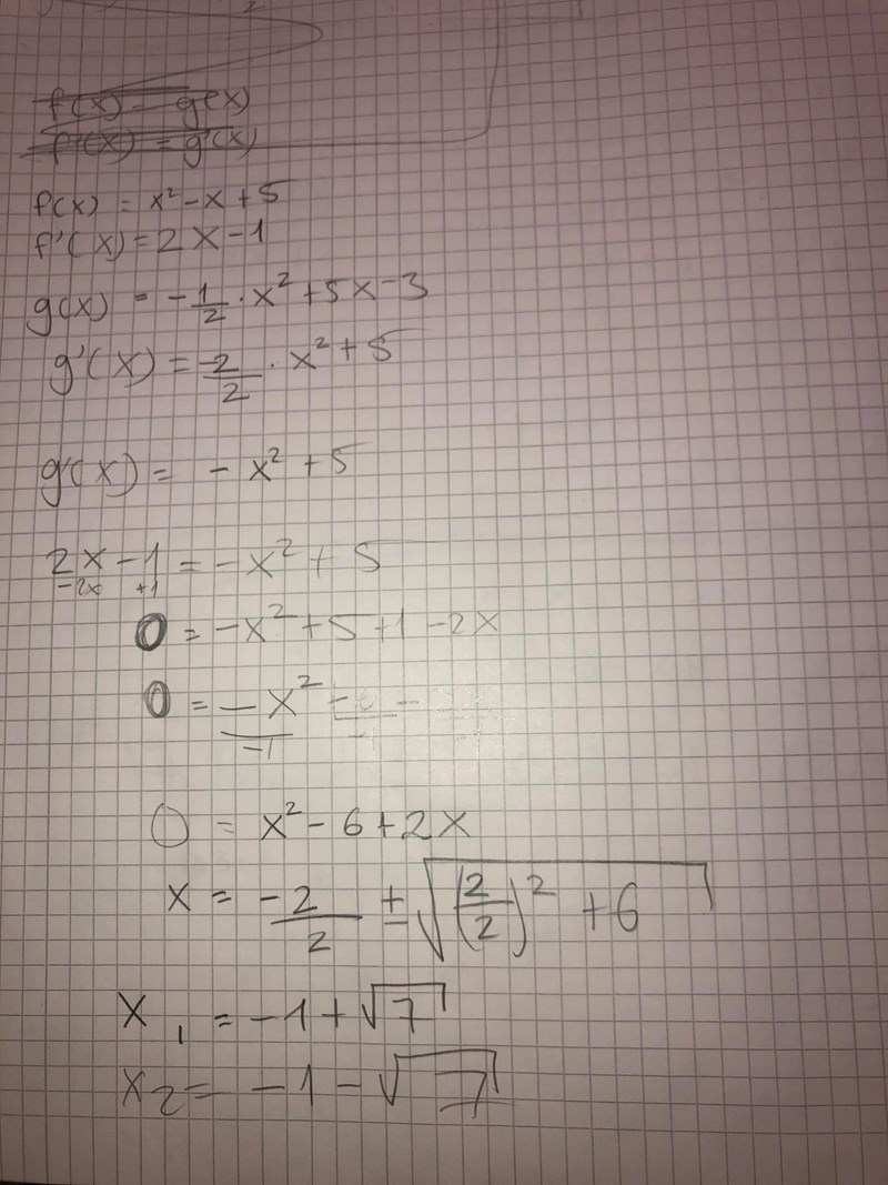 Kom ihåg att minska exponenten med ett när du deriverar potenser! Du gjorde det på f'(x), men inte på g'(x).