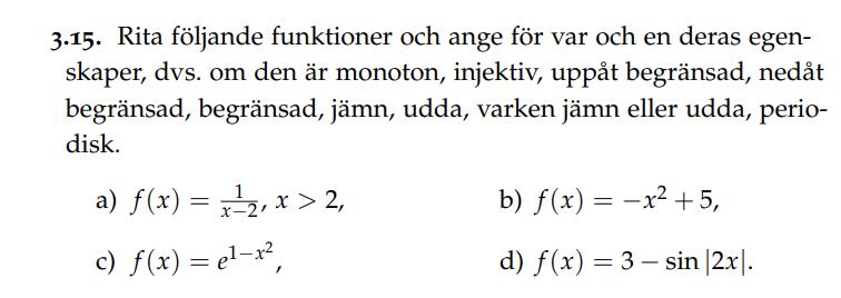 Eftersom du vill ta reda på om den är begränsad, peridoisk, jämn, udda, injektiv etc så kan du besvara alla samtidigt genom att skissa funktionen. Ta fram eventuella extempunkter, teckentabell och gör en ungefärlig skiss.