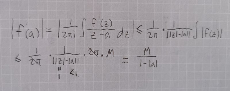 Välj något i enhetsskivan. Om vi väljer tillräckligt litet så kan vi konstruera en cirkel inuti enhetsskivan, centrerad i med radien . är holomorf i området innanför så Cauchys integralformel ger Derivatan av detta ges av Ta beloppet på båda sidor för att få När detta är gjort kan vi ta gränsvärdet av båda sidorna av olikheten då går mot . Notera att vi inte kan välja från början då måste vara holomorf på kurvan för att vi ska kunna tillämpa Cauchys integralformel.