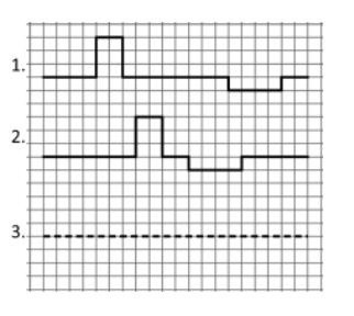 Figur 1 Visar läget vid tidpunkten t0 av två fyrkantspulser, som rör sig mot varandra med konstanta hastigheter. Samma pulsers lägen vid tidpunkten t0+t1 framgår av figur 2. Rita upp hur pulsbilden ser ut vid tidpunkten t0+2t1 i figur 3.