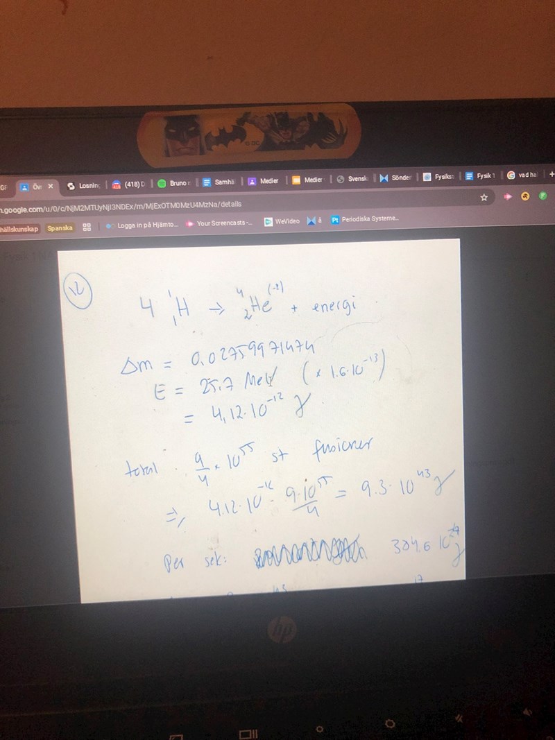 och för att ta reda på antal fussioner delar hon antalet atomer med 4 för att ta reda på hur många sönderfall som sker. Men vadå är det inte bara 2 sönderfall per 4 väteatomer?
