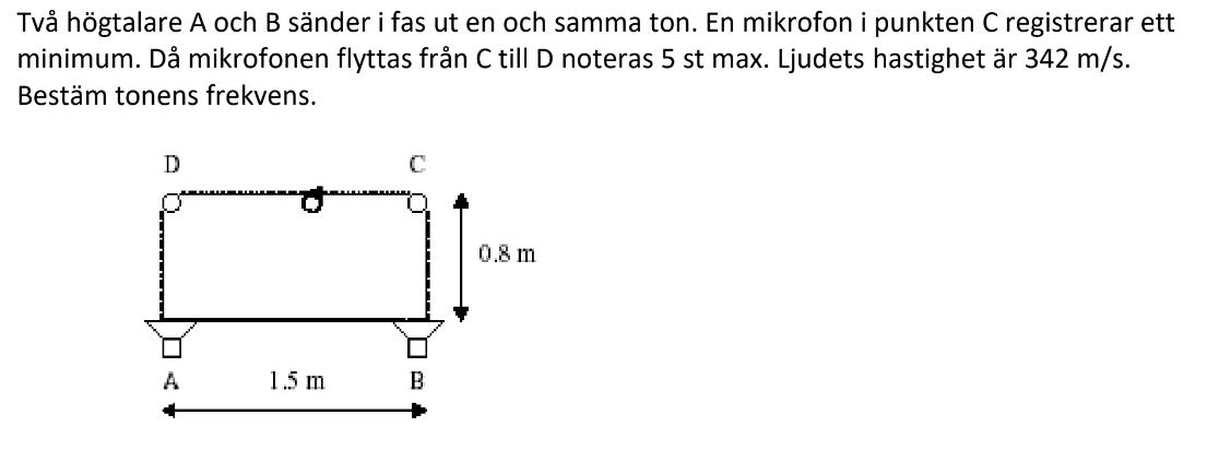 Har arbetat med denna uppgift ett tag nu men kommer ingenstans.. Har ritat upp den själv på papper för att försöka se hur jag ska göra, men står helt fast. Har gjort liknande uppgifter tidigare och försökt ta hjälp av dem, men då har jag vetat frekvensen. Hur jag ska beräkna frekvensen när jag inte vet våglängden?! Tacksam för hjällp och svar 🙏