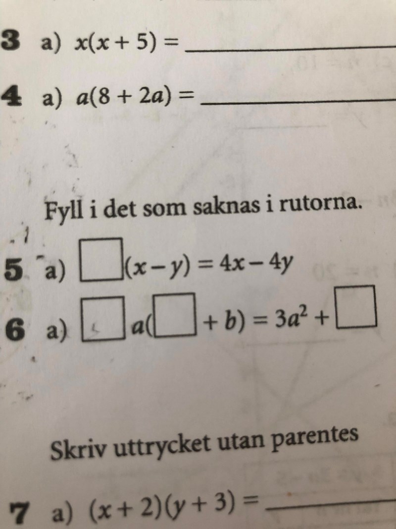 Utveckla uttrycket x(x+y) och se vad det blir. Sen gör du samma sak på a(3a+b).