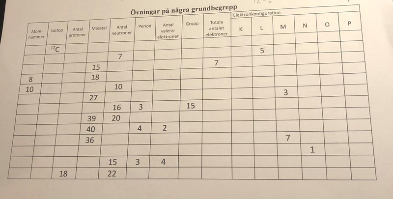 Sedan är det bara att fortsätta fylla i, med period, valenselektroner etcetera för denna rads isotop.