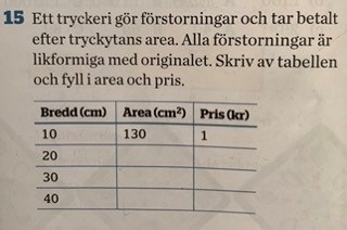 Andra raden gäller en förstoring som har bredden 20cm. Vad har den för höjd?