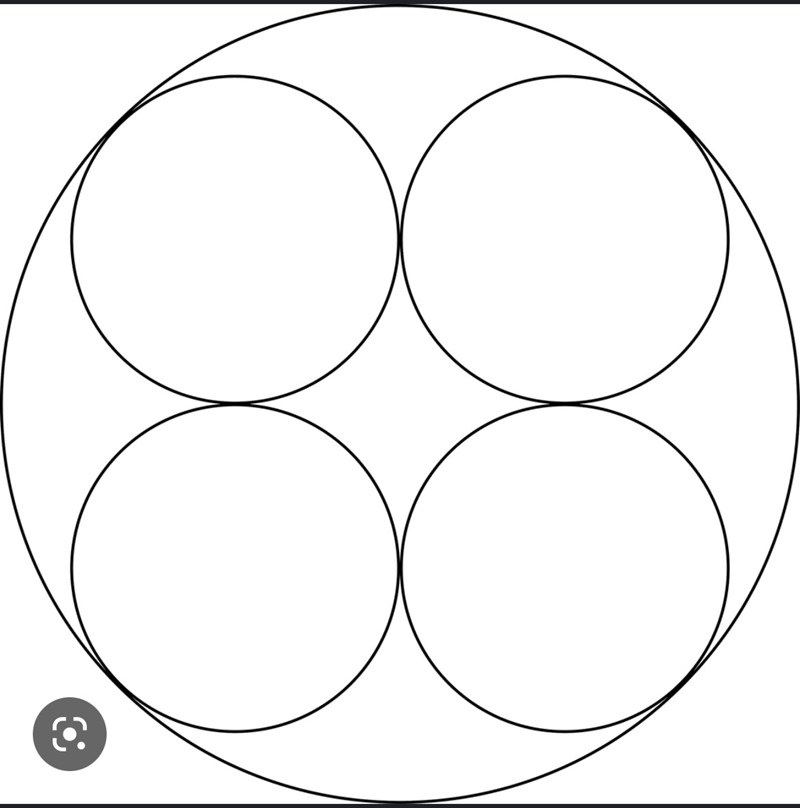 Uppgift med 4 A-poäng, Ma1c. Man ska ta reda på hur stor del av den stora cirkeln som de fyra små fyller. Jag har löst uppgiften men vill se hur andra kommer fram till ett svar (har inget facit).Det enda man fick till uppgift var denna bild: