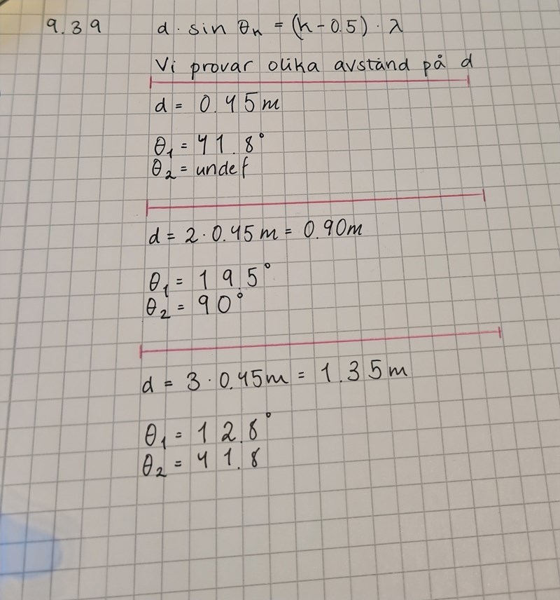 Men den för den minsta vinkeln (θ1) får jag värdena 41,8°, 19,5° och 12,8° beroende på vilket värde på d jag använder.