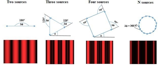 Här en bild som visar fasorerna vid första minimum, bland annat när det finns fyra källor.