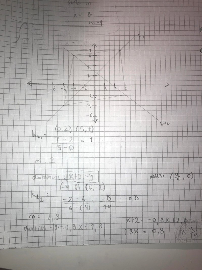 Den första linjen går genom punkterna (5,7) och (-6,-4). Vilket k-värde har denna linjen? Sätt in detta k-värde och koordinaterna från den ena punkten i sambandet y=kx+m och beräkna m.