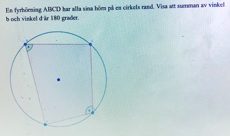 Komstruera medelpunktesvinklar och använd randvinkelsatsen.