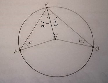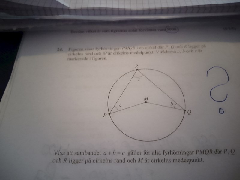 Visa att sambandet a+b=c gäller p, q och r ligger på cirkelns rand, och M är mittpunkten.