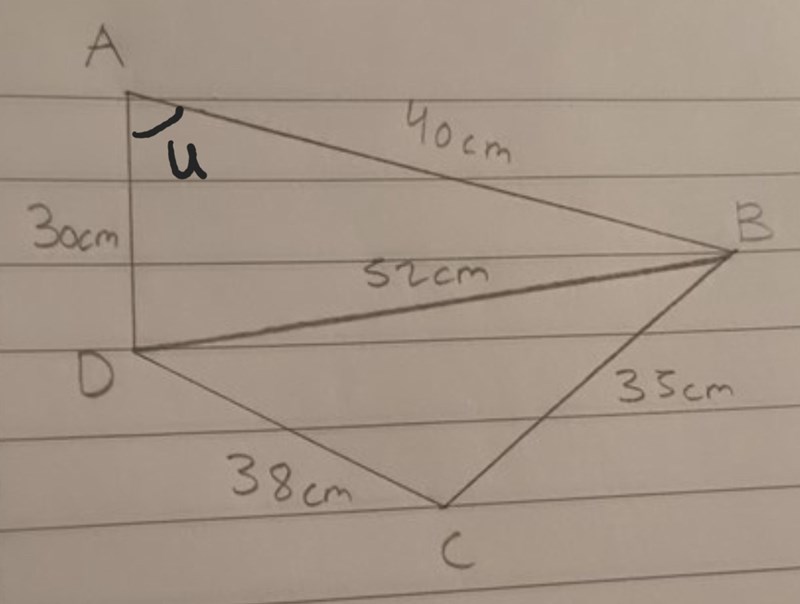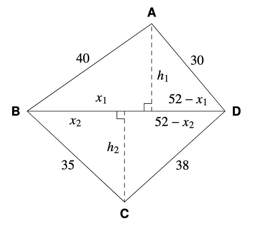 En fyrhörning ABCD har sidlängderna AB = 40 cm, BC = 35 cm, CD = 38 cm och DA = 30 cm. Dessutom är diagonalen BD = 52 cm. Hur stor är fyrhörningens area?