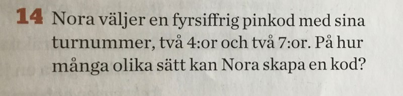 Annars kan du tänka så här: Du kan placera den första sjuan på 4 olika sätt och den andra sjuan på två tre olika sätt - sdan är det självklart var de båda fyrorna skall vara. Men om du gör så, räknar du varje kombination 2 ggr - det blir ju ingen skillnad om du t ex först sätter en sjua på plats 1 och sedan en på plats 4, eller om du först sätter en sjua på plats 4 och sedan en på plats 1. Då blir det 4*3/2 = 6 olika varianter.