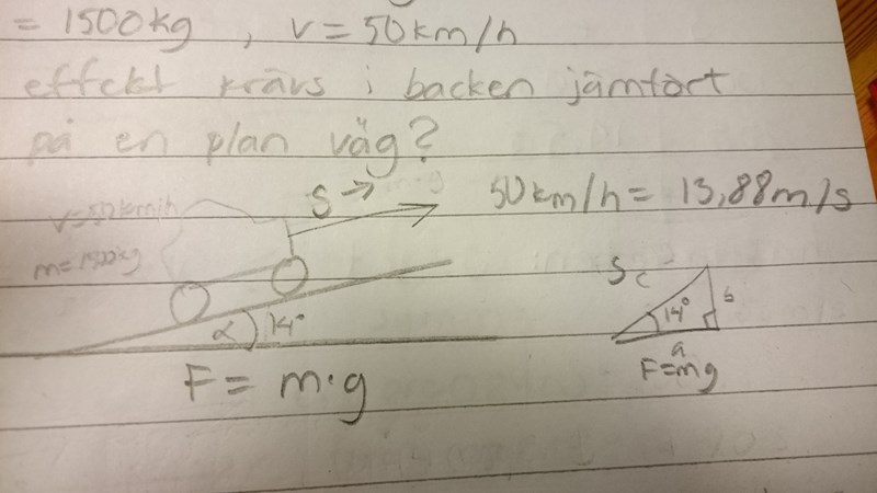 flint skrev:En bil kör uppför en backe med lutningen 14grader. Bilen väger 1,5 ton och har hastigheten 50km/h. Hur mycket mer effekt krävs i backen jämfört med att köra på en plan väg?