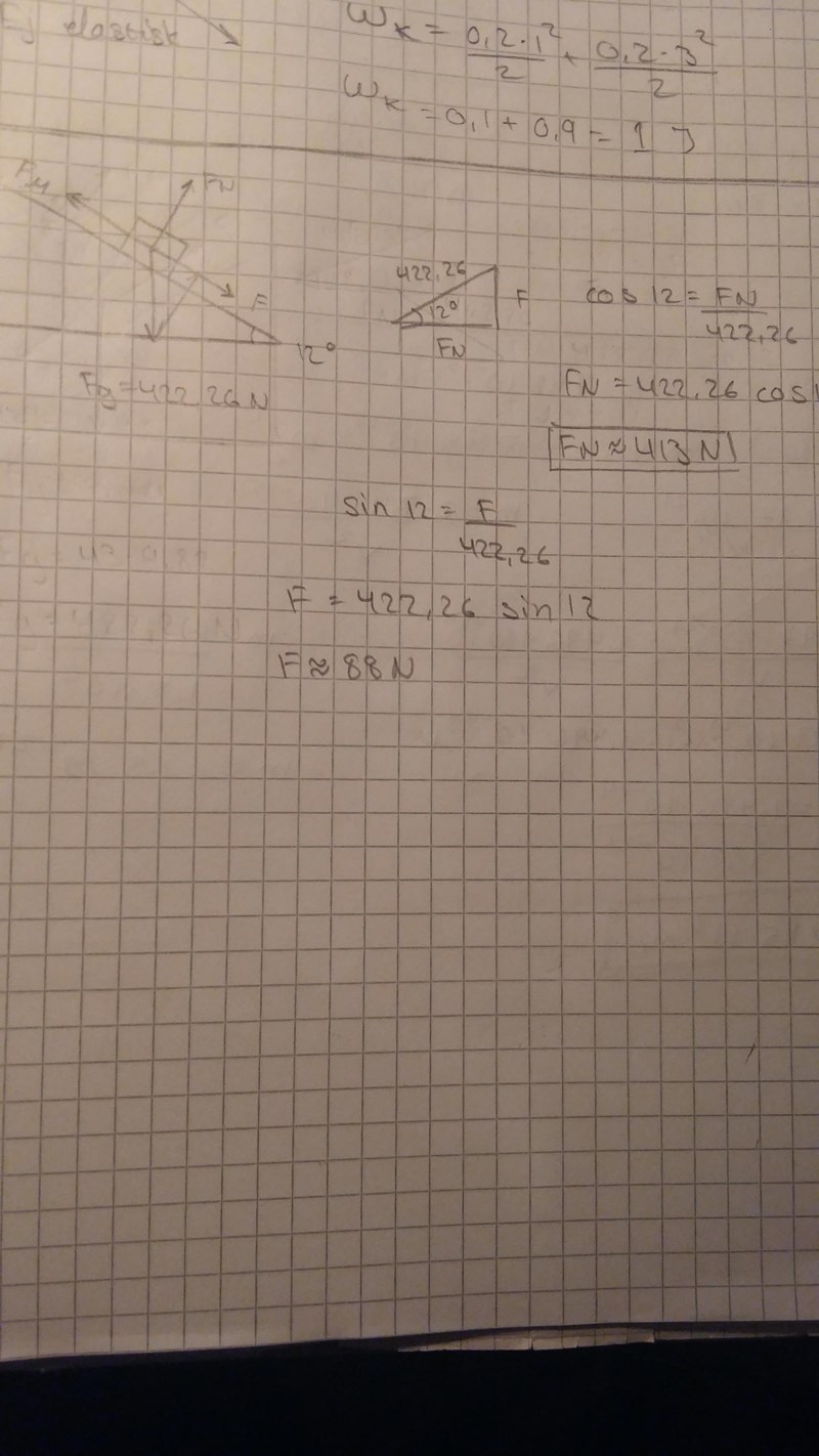mg cos (12) blir ungefär 413N. Jag förstår inte varför man ska sätta det lika med 0. Kraften F får jag till 88 N.