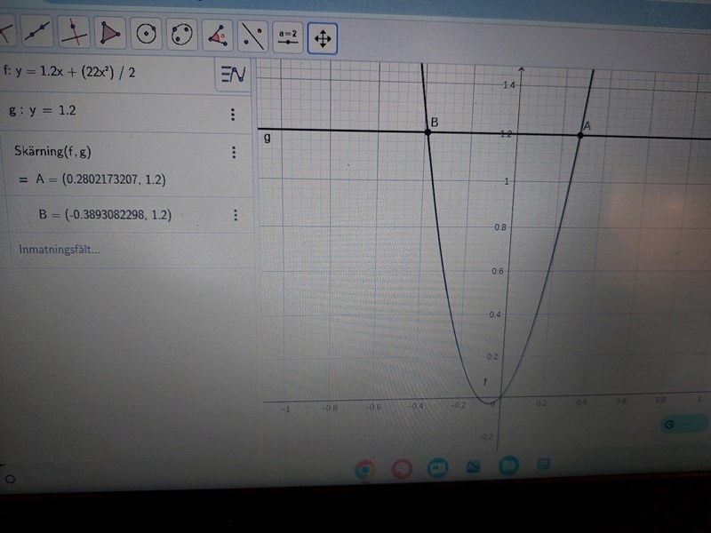 uppgift 357 är nämligen om fall. A fixade jag bra men b var lite svårare eftersom det blir en andragradsfunktion. Man fick använda sig av geogebra och rita upp den. Dock så har jag lite problem med att tolka grafen. Formeln jag använde var S=V(0)×t+(a×t^2)/2 och värdena S=1,2m