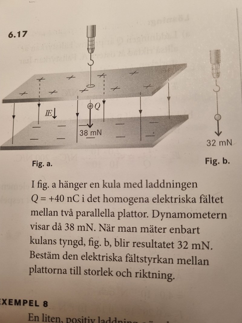 Frågan lyder i bilden. Förstår inte hur det ska gå att komma fram till fältstyrkan mellan plattorna då jag inte på något sätt kan räkna ut plattornas laddning. Utan en längd mellan plattorna och utan en laddning blir det väldigt svårt att komma fram till den elektriska kraften. Har bara testat en massa formler och förstår inte riktigt varför jag behöver massan (figur 2).