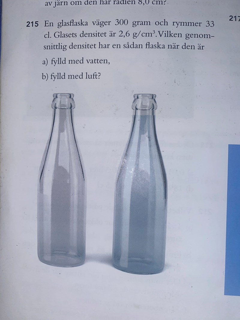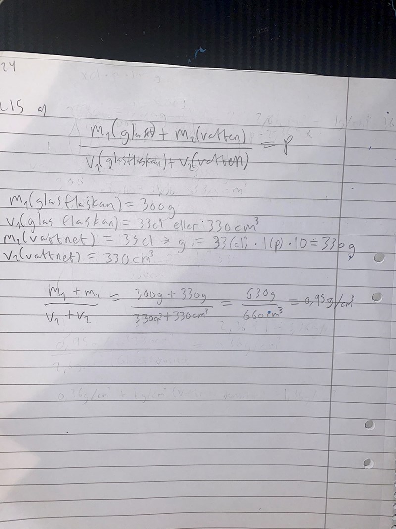 Jag har delat massan av både glaset och vatten med volymen av de båda och fått svaret 0,95g/cm*3 men i facit står det att det rätta svaret är 1,4g/cm*3