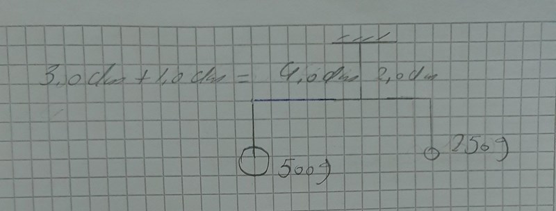 Tänk dig att du byter ut de båda nedersta bollarna (och pinnen) mot en enda klump. Hur mycket skulle den behöva väga, för att det skall vara jämvikt mellan den och 250 g-bollen?