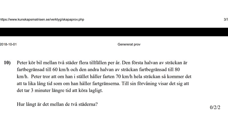 Läs frågan igen: Det tar 3 minuter längre tid att köra 60km/h och 80km/h.
