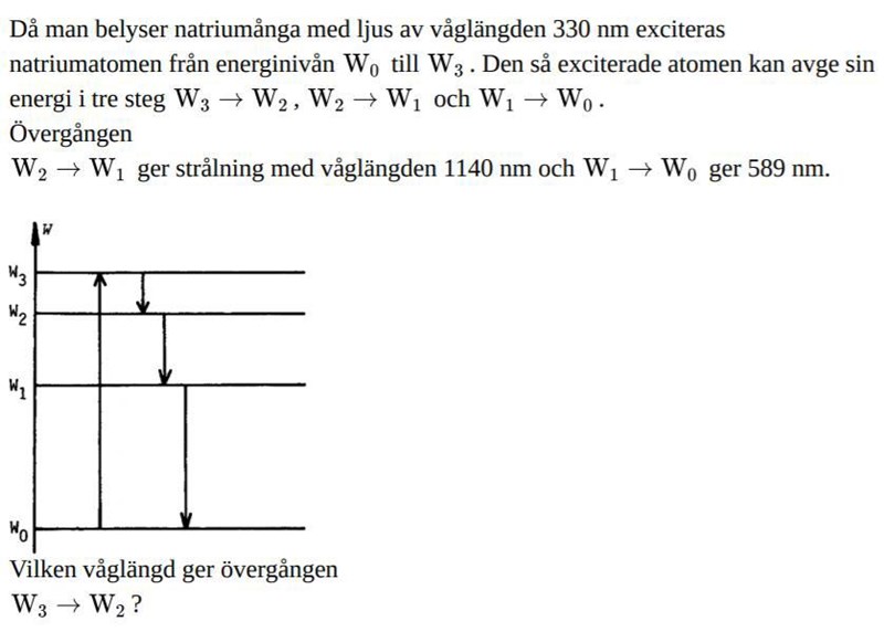 jag förstår för att få ut våglängden använder man E=h*f = hc/lambda, jag letar inte efter svaret utan en del av beräkningen för få ut w3---> w2 så jag kan fortsätta göra sista delen för att få ut våglängden,